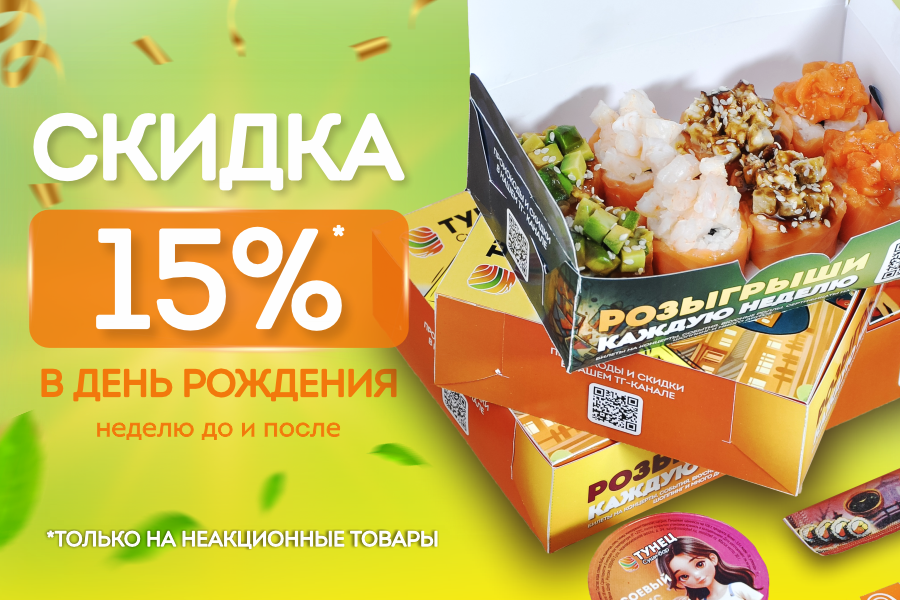 ****В период за 7 дней до и после дня вашего рождения скидка по карте составит 15%. Скидка не действует на акционные товары. Применить списание накопленных бонусов к данной покупке не возможно. Бонусы за такую покупку не будут начислены.